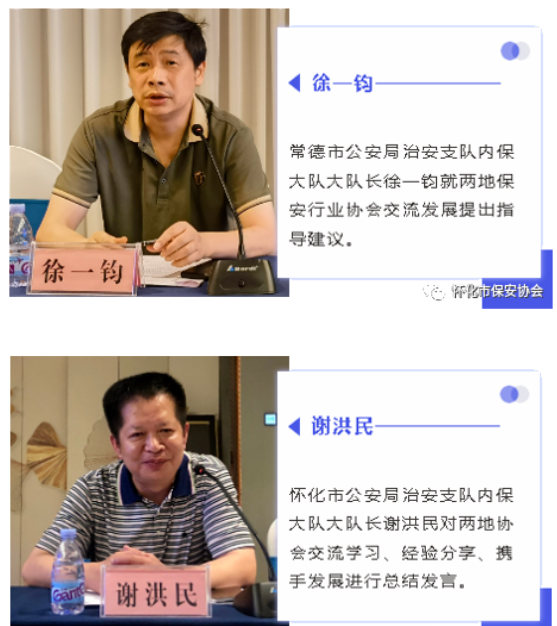 對于兩地協(xié)會此次的交流座談,徐一鈞大隊長和謝洪民大隊長分別作總結(jié)發(fā)言,他們表示常德、懷化兩地協(xié)會要加強交流學習與合作,在保安行業(yè)發(fā)展領域積極探索創(chuàng)新,多分享經(jīng)驗,攜手互助,為兩地保安服務規(guī)范化與高質(zhì)量發(fā)展在全省作出亮點而并肩努力。
