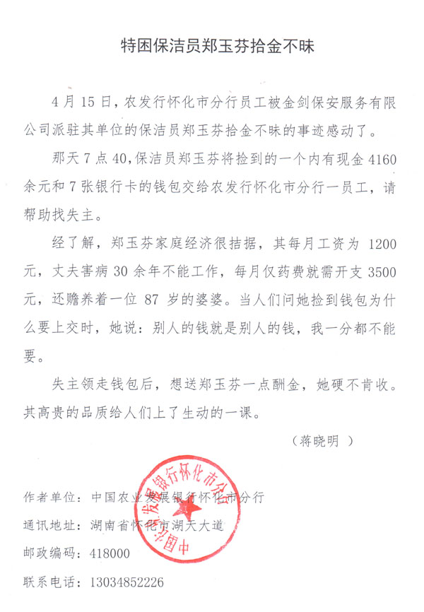 4月15日,中國農(nóng)業(yè)發(fā)展銀行懷化市分行員工被金劍保安服務(wù)有限責(zé)任公司派駐其單位的保潔員鄭玉芬拾金不昧的事跡感動了。